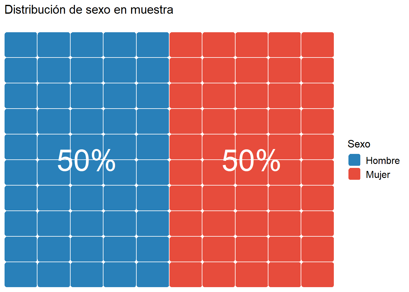 Luego, tomamos una muestra de 100 personas al azar, y veremos la distribución de sexo en ella… ¡Es muy parecida a la población!2 ¿Magia? No, estadística.