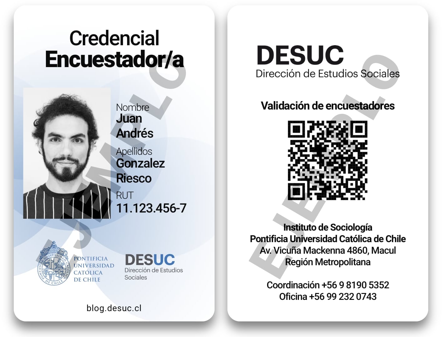 Durante el proceso de encuestaje, las personas encuestadoras portarán su credencial de DESUC, que se muestra en la siguiente imagen. En ella se muestra en el anverso un código QR el cual lleva a la página de verificación, para mayor seguridad de los establecimientos educacionales.