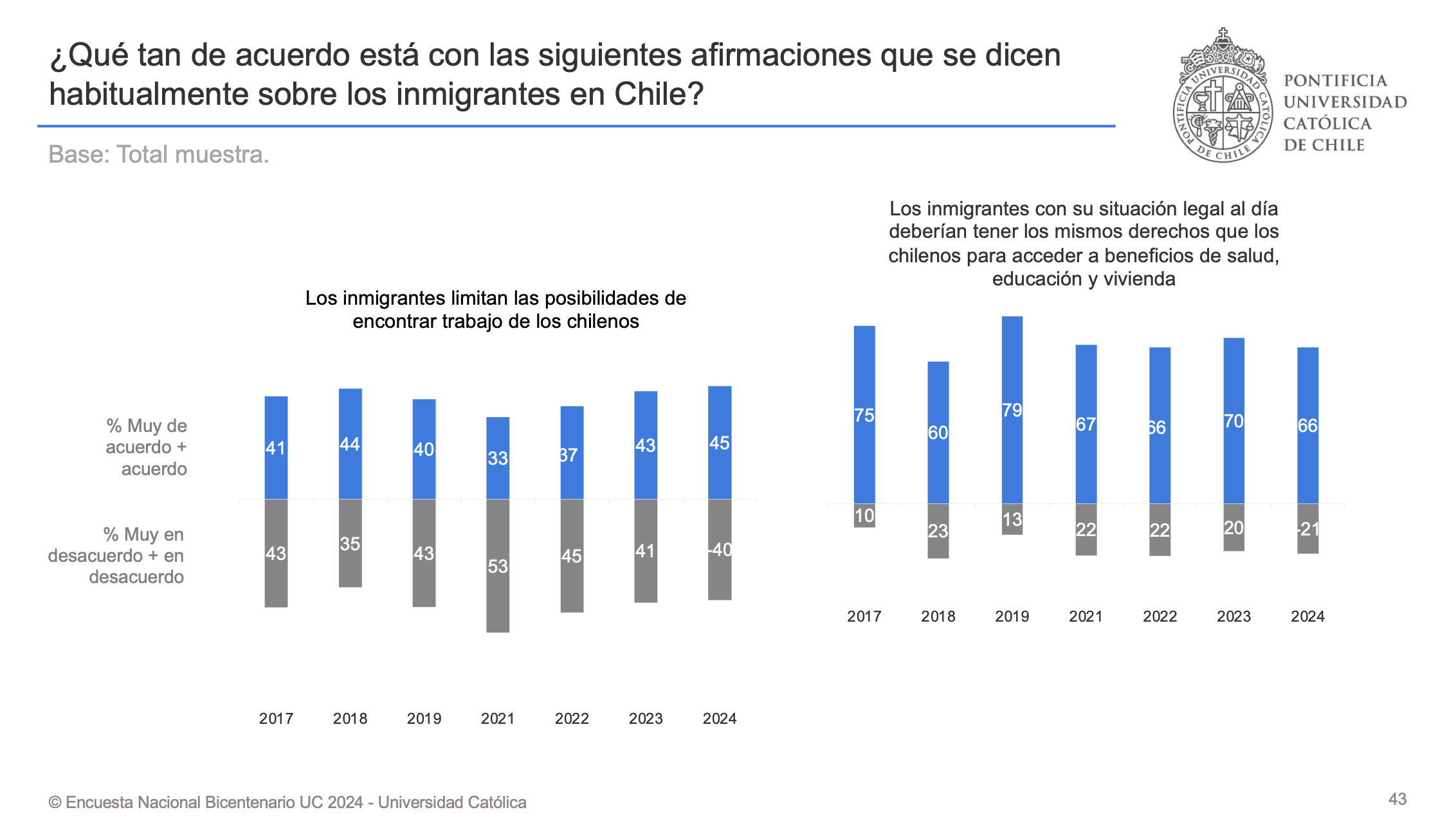 La Figura 1 presenta una de las láminas de resultados de la encuesta del año 2024, donde se muestran los vaivenes de la actitud asociada a las personas inmigrantes desde el año 2017. Este y otros datos son los que esta encuesta se ha abocado a observar y que permite a la opinión pública, tomadores de decisiones e investigadores tener información respecto de los cambios de la sociedad chilena.
