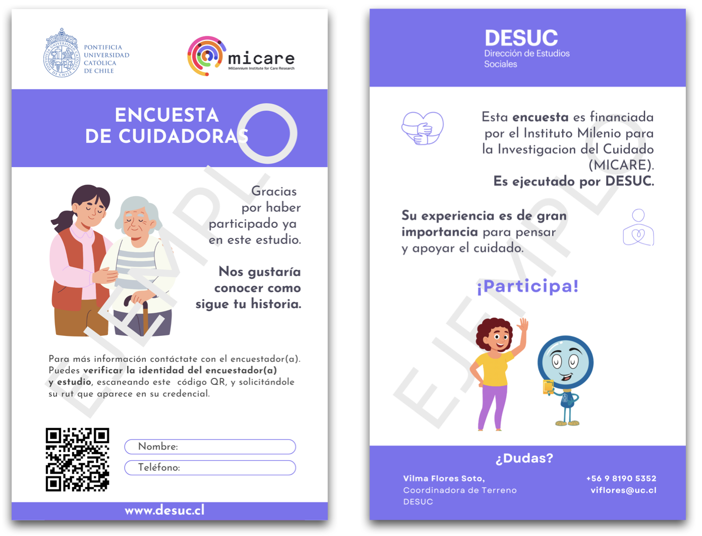 Ante cualquier consulta sobre la encuesta o el trabajo de terreno, las personas pueden contactar al equipo de DESUC a través de los datos informados en el volante oficial, específicamente a la Coordinadora General de Terreno DESUC, Vilma Flores Soto cuyo mail es: viflores@uc.cl.